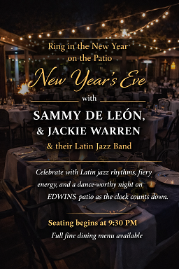 Celebrate New Year’s Eve under the lights with irresistible Latin jazz, fiery rhythms, and a lively outdoor atmosphere. Seating begins at 9:30 PM, with our full fine dining menu available, inviting you to dance, dine, and count down to midnight in true EDWINS style.