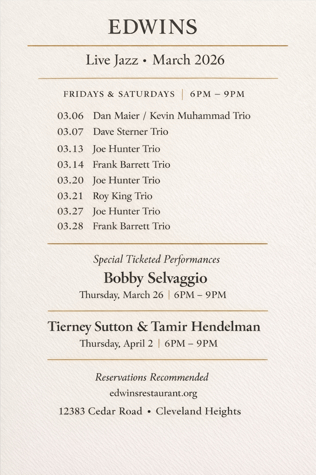 Candlelit evenings, refined dining, and internationally recognized jazz artists define the live music experience at EDWINS. Join us throughout the winter and spring for thoughtfully curated performances that pair seamlessly with dinner, cocktails, and conversation in the heart of Cleveland Heights.
