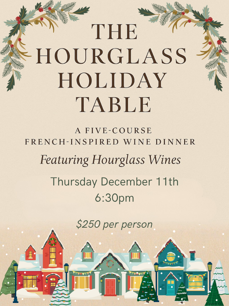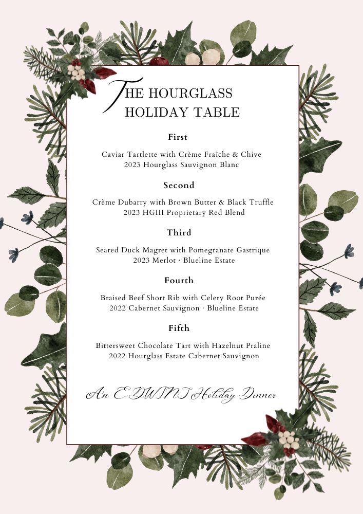 “The Hourglass Holiday Table” is an intimate, once-a-season dinner celebrating winter’s most elegant flavors paired with the extraordinary wines of Hourglass. This five-course French-inspired menu unfolds slowly, beginning with a lavish caviar course and moving through rich holiday classics like truffled velouté, seared duck, and slow-braised beef — all culminating in a luxurious chocolate finale. Each dish is matched to a different Hourglass wine, showcasing the expressive structure of Sauvignon Blanc, the warmth of HGIII, the plushness of Blueline Merlot, and the depth of two remarkable Cabernets.